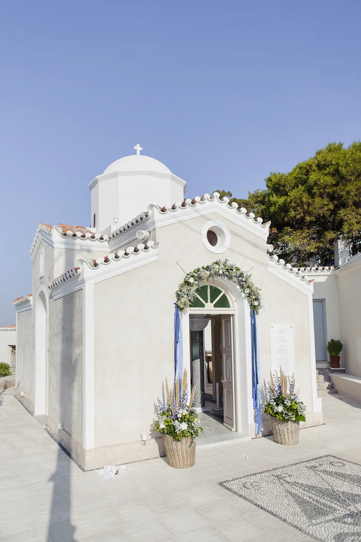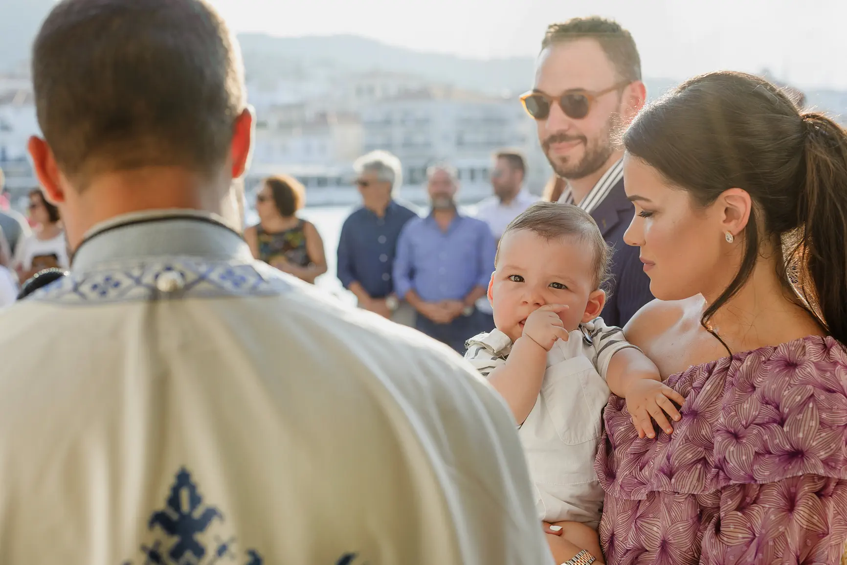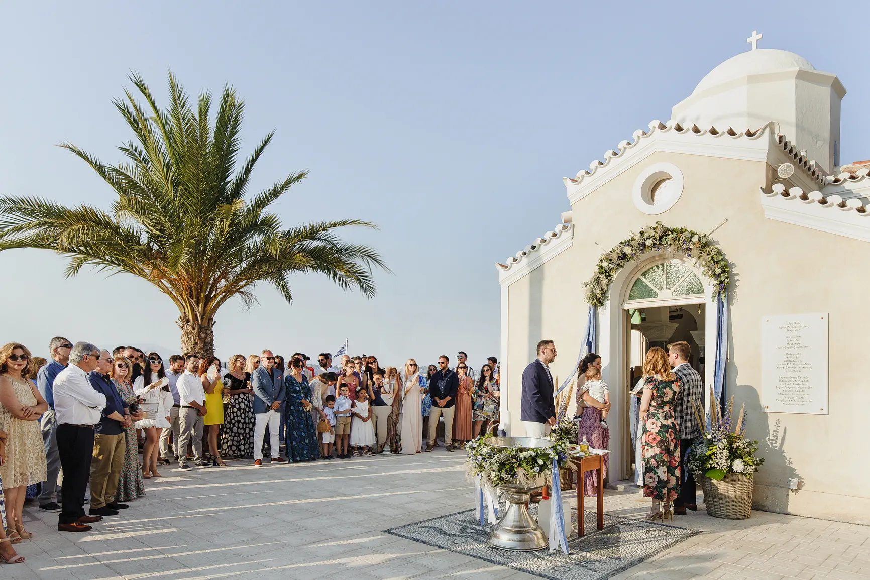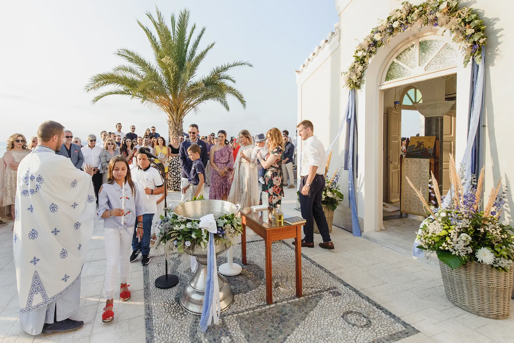 The heart of the day beat in an idyllic chapel, literally on the wave. The atmosphere was serene and sacred, with the sound of the sea silencing the chanting and the salt mingling with the smell of incense. There, beside the endless blue, Lambros received his blessing and his name, in the arms of his proud parents and excited godparents. The simplicity and beauty of the landscape added a unique dimension to the sacredness of the moment.